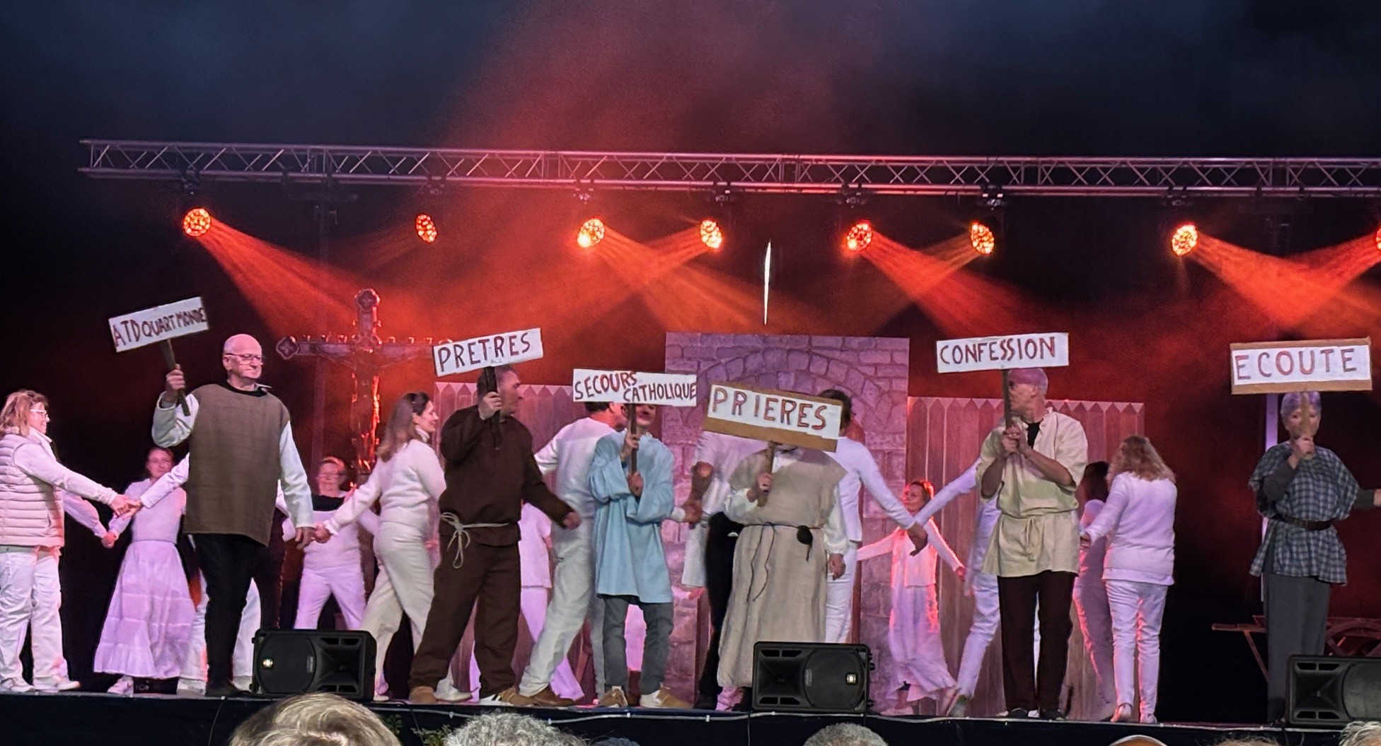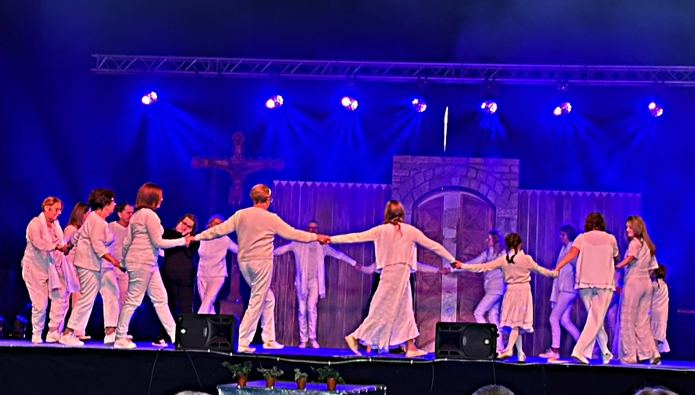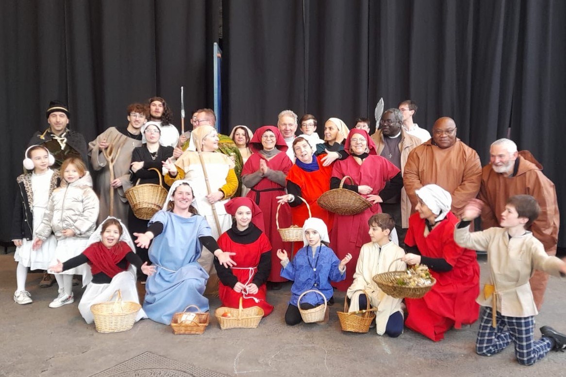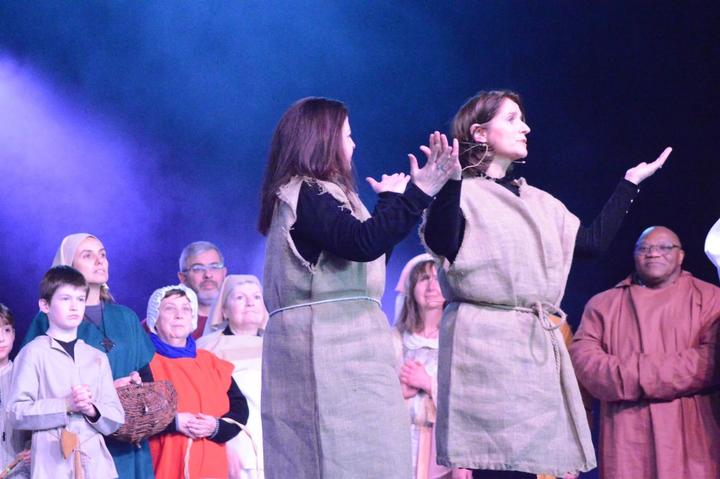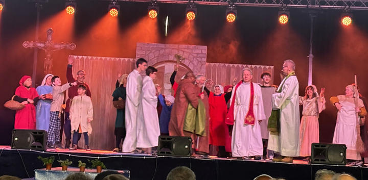 À 14h, le rideau rouge s’est ouvert pour découvrir le spectacle Saint-Géry. Ce spectacle en six tableaux retraçait sa vie, évêque de Cambrai au VIIe siècle et saint patron de notre diocèse (dont nous avons fêté en 2025 le 1400e anniversaire de sa mort). De nombreux bénévoles (70 acteurs et danseurs, couturières…) se sont mobilisés pendant plus d’un an pour donner vie à ce beau spectacle très applaudi !