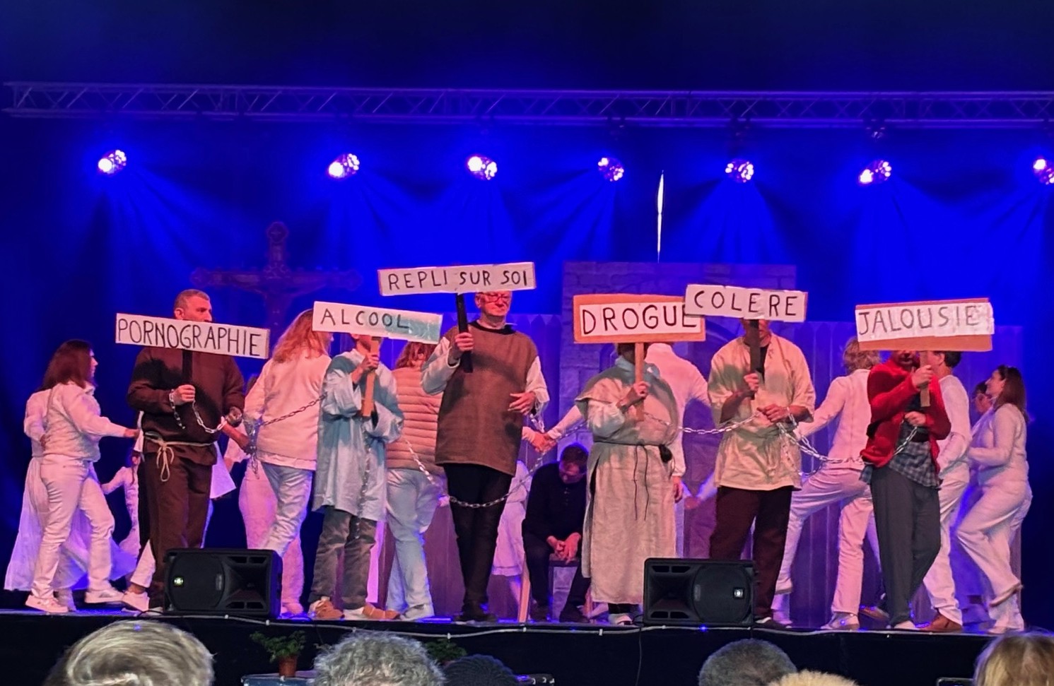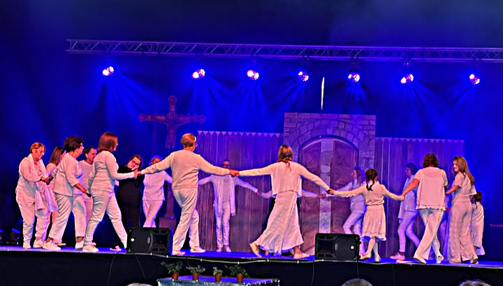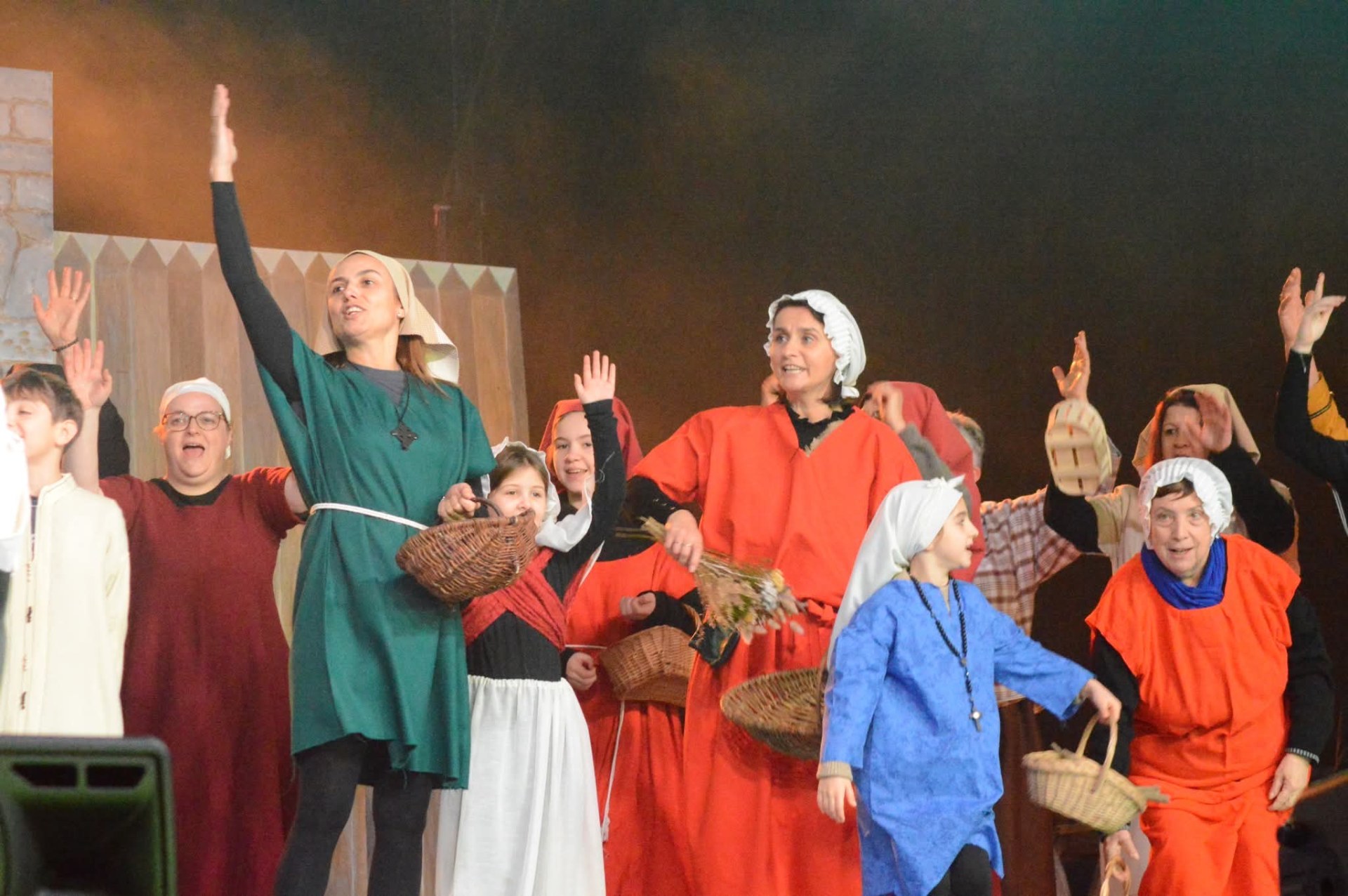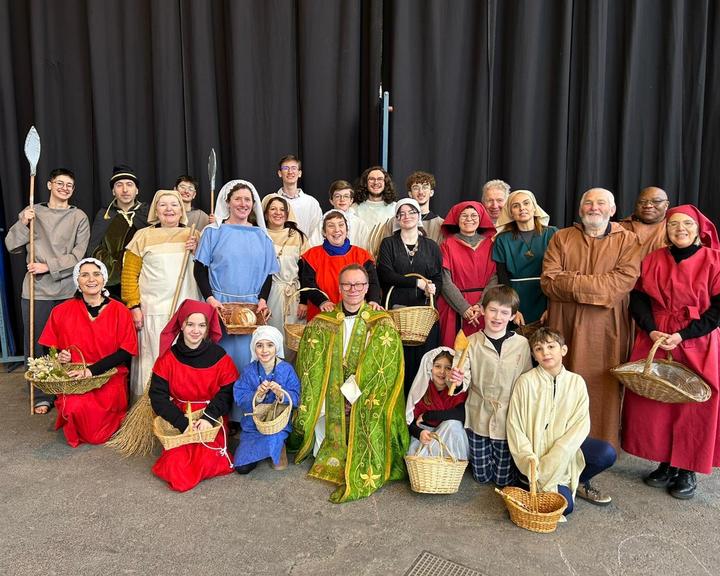 À 14h, le rideau rouge s’est ouvert pour découvrir le spectacle Saint-Géry. Ce spectacle en six tableaux retraçait sa vie, évêque de Cambrai au VIIe siècle et saint patron de notre diocèse (dont nous avons fêté en 2025 le 1400e anniversaire de sa mort). De nombreux bénévoles (70 acteurs et danseurs, couturières…) se sont mobilisés pendant plus d’un an pour donner vie à ce beau spectacle très applaudi !